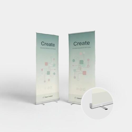 Unsere Roll-up-Systeme bestehen aus einem Aluminium-Gestell, drei schmalen Aluminium-Stangen und einem Werbebanner aus PVC, Polyester-Gewebe oder Polyester-Folie. Das System lässt sich im Nu ohne Werkzeug aufbauen und ist mit einem Gewicht von nur fünf Kilogramm in der inklusiven Transporttasche leicht zu transportieren. Bei der Auswahl des Systems stehen einseitige und zweiseitige Varianten, also Systeme, die mit nur einem oder zwei Bannern (Vorder- und Rückseite) versehen werden können, zur Verfügung. Alle Roll-up-Banner werden einseitig vierfarbig bedruckt und als Indoor- und Outdoor-Display angeboten.
