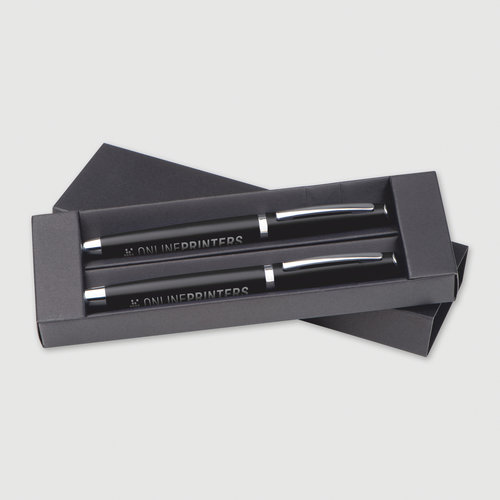 Schreibsets bestehend aus einem Drehkugelschreiber und einem Tintenroller aus Metall in einer Pappschachtel