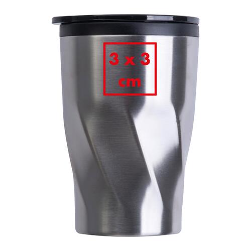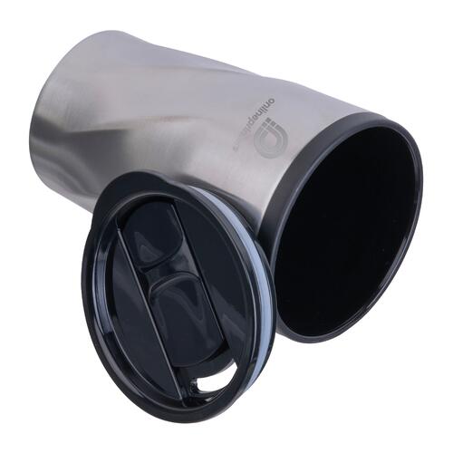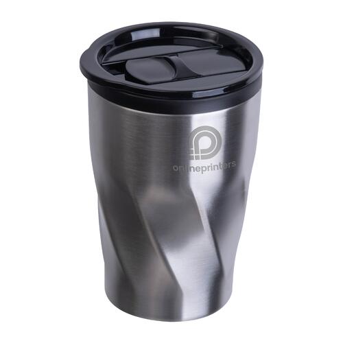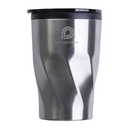 - Doppelwandiger Thermobecher aus Edelstahl mit Kunststoffinnenteil (PP), einem Deckel mit Trinkschiebeleiste sowie einem Fassungsvolumen von 350 ml